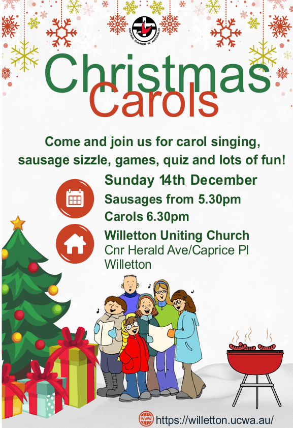 Christmas Carols Join us for a lovely night of Christmas Carols and Sausage Sizzle. Fun night for the whole family! Sausage Sizzle - starts at 5:30 pm Christmas Carols - starts at 6:30 pm